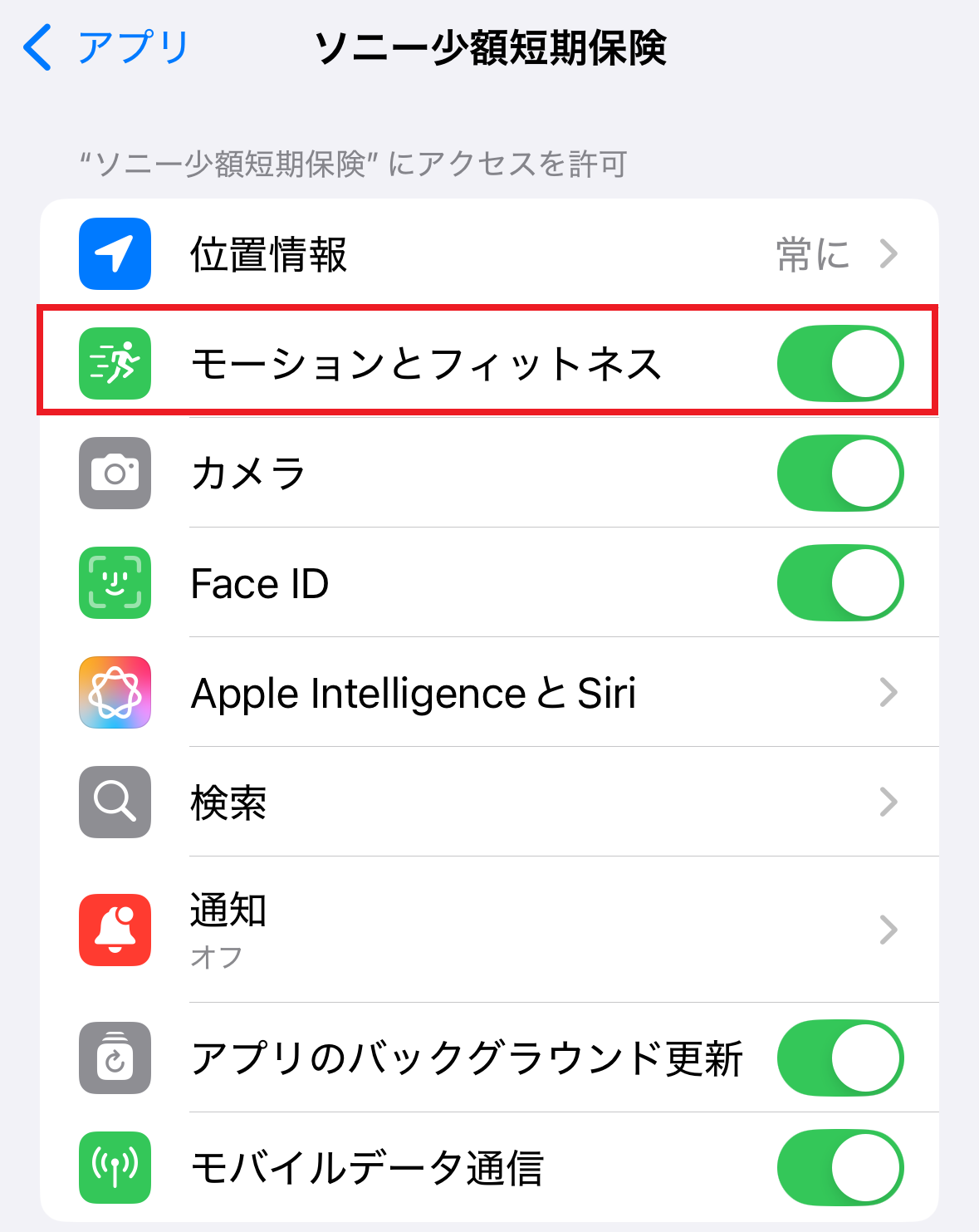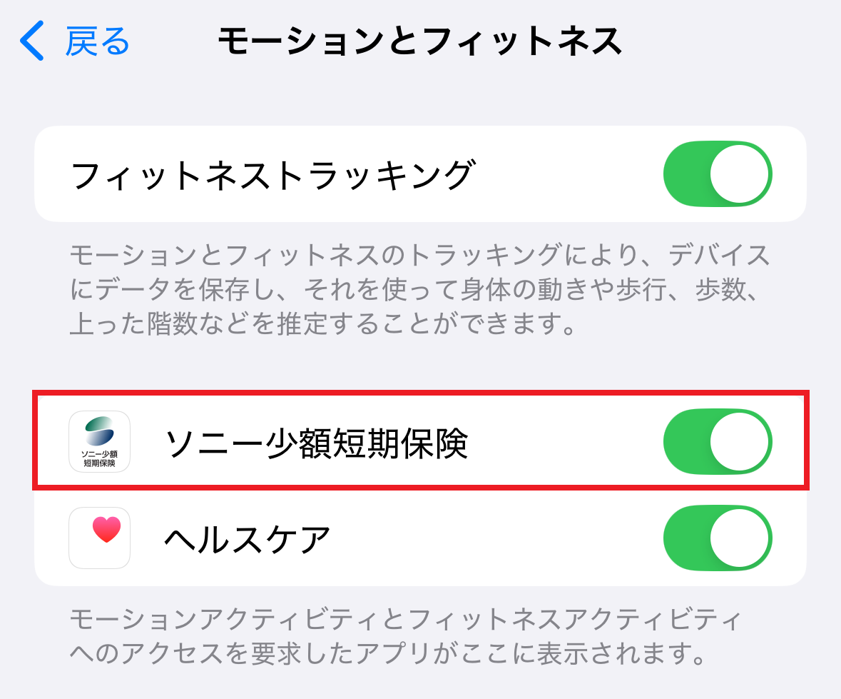設定>アプリ>ソニー少額短期保険>モーションとフィットネスをONにします。