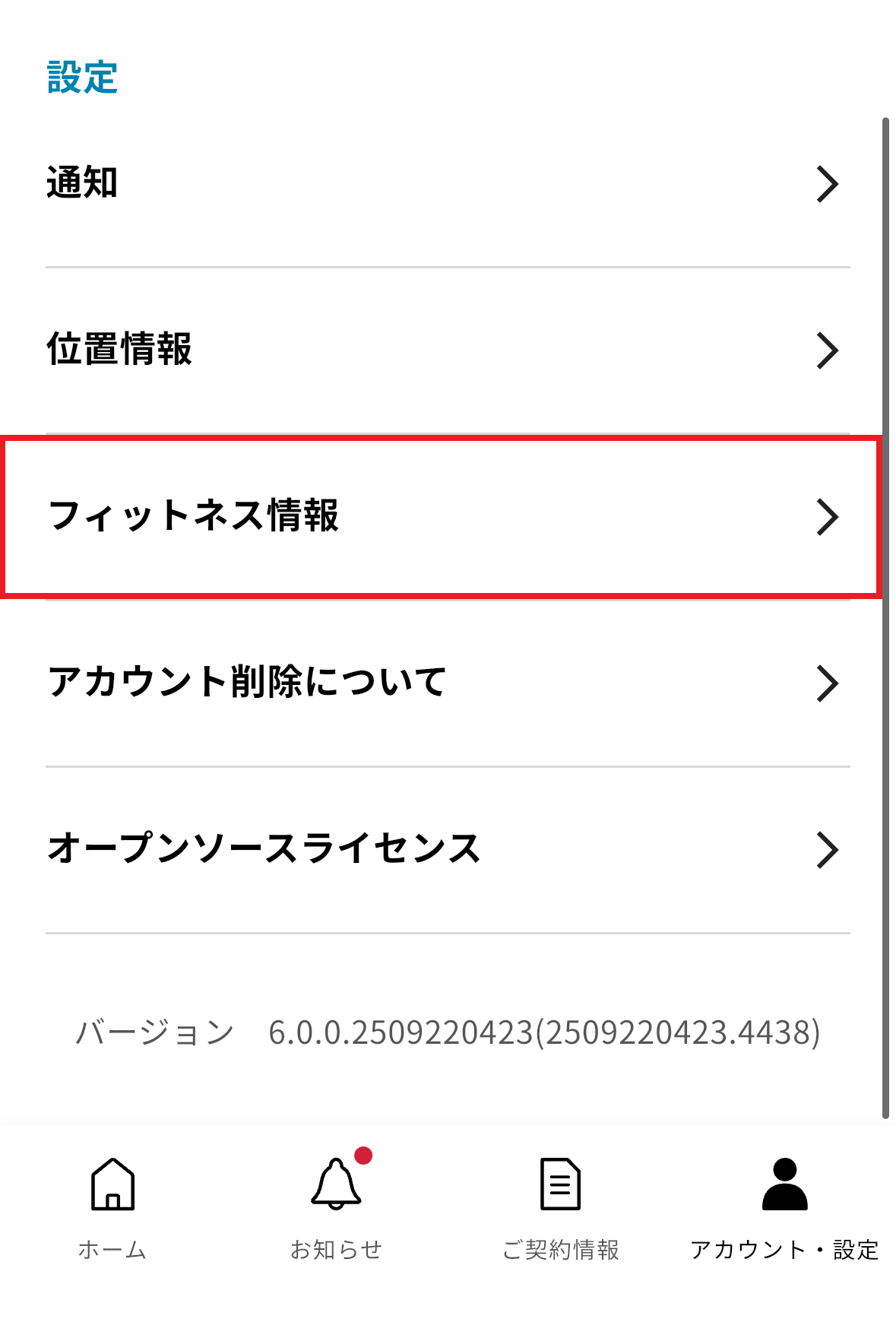 ソニー少額短期保険アプリを開き、右下のアカウント・設定>フィットネス情報 をタップするとモーションとフィットネスへのアクセス許可のメッセージが表示されます。